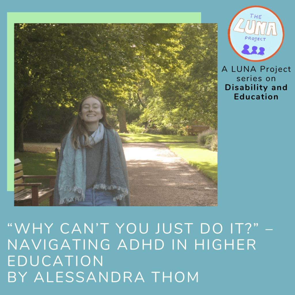 Image description: The image is a blue infographic with colourful green rectangles in the background. In the foreground there is a photo of Alessandra stood outside smiling. Below is the writing (in white) that says ““Why can’t you just do it?” – Navigating Higher Education with ADHD by Alessandra Thom” In the top righthand corner is the LUNA project logo and and the text (in black) “A LUNA project series on Education”. End of description.