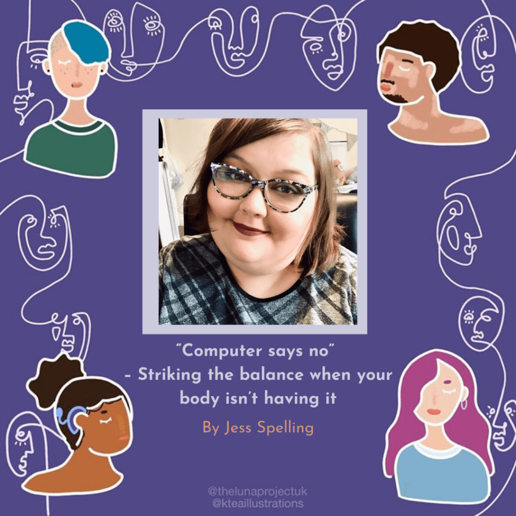 Image Description: The background is a dark purple. In each corner there is a beautifully illustrated colourful head and shoulders. They are Disabled people of a variety of genders and ethnicities. Running between these people are continuous white line drawings of abstract faces. This was created by @kteaillustrations. In the centre there is a silvery box with a picture of Jess inside. Underneath is the text “Computer says no”